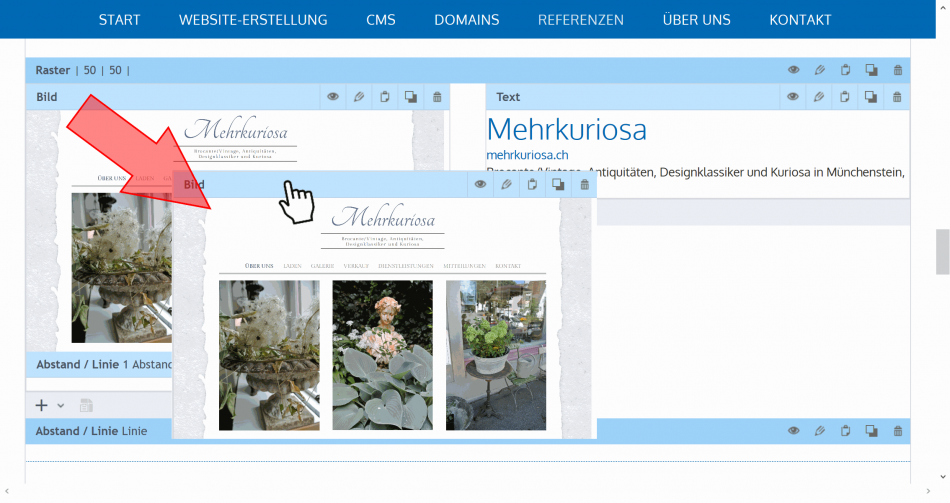 Ziehen Sie die Inhalte Ihrer Website einfach mit der Maus per «Drag&Drop» an die gewünschte Stelle! So einfach kann es sein, Inhalte von einer Stelle an eine andere zu verschieben. Bilder werden dabei automatisch in der Grösse angepasst.